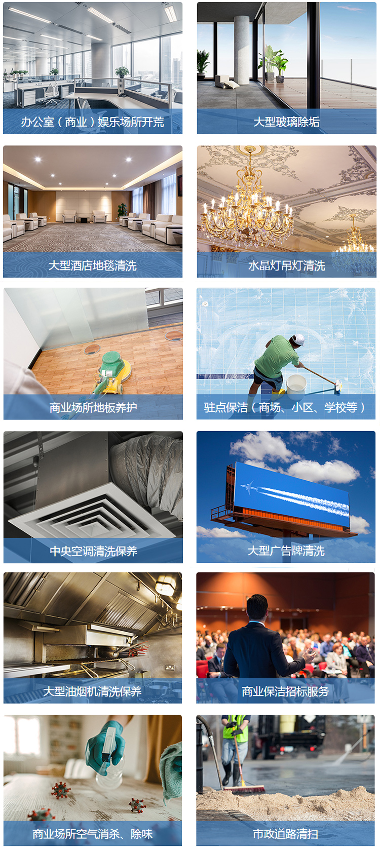 商業(yè)工程服務(wù)項目包含:辦公室娛樂產(chǎn)所等開荒保潔、大型玻璃除垢、中央空調(diào)清洗、大型油煙機(jī)清洗、大型廣告牌以及市政道路清掃服務(wù)等等。